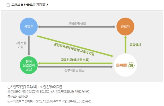 지원절차는 위의 그림과 같습니다. 사업주가 전체 교육비의 10%를 은혜론에 지급하고, 은혜론이 산업인력공단에 위탁교육 실시신고 및 고용보험 가입여부를 확인합니다. 근로자 교육을 실시하고, 교육종료 후 은혜론이 산업인력공단에 수료보고 및 정부지원금 신청 및 수령을 합니다.