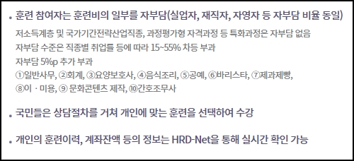 저소득계층 및 국가기간전략산업직종, 과정평가형 자격과정 등 특화과정은 자부담이 없으며 자부담 수준은 직종별 취업률 등에 따라 15~55%로 차등부과합니다. 자부담이 5%p 추가 부과되는 직종은 위의 내용을 참고하세요. 국민들은 상담절차를 거쳐서 개인에게 맞는 훈련을 선택하여 수강할 수 있고, 개인의 훈련이력 및 계좌잔액 등의 정보는 HRD-Net을 통하여 실시간으로 확인할 수 있습니다.