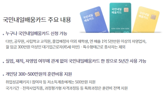 실업, 재직, 자영업 여부에 상관없이 국민내일배움카드 한장으로 5년간 사용할 수 있으며 개인당 300~500만원의 훈련비용을 지원합니다. 취업성공패키지1 참여자 등 저소득계층에게는 500만원을 지원하고