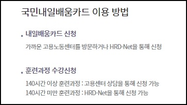 내일배움카드는 가까운 고용 노동센터를 방문하거나 HRD-Net을 통하여 신청할 수 있고, 140시간 이상 훈련과정은 고용센터 상담을 통하여 신청이 가능하며 140시간 미만 훈련과정은 HRD-Net을 통하여 신청이 가능합니다.