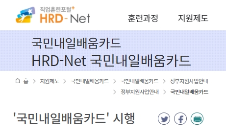 직업훈련포털 HRD-Net 페이지에 접속해서 국민내일배움카드 또는 내배카에 대한 안내를 살펴보도록 하겠습니다. 홈화면에서 지원제도, 국민내일배움카드, 정부지원사업안내, 국민내일배움카드 메뉴순으로 들어가시면 됩니다.