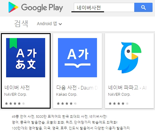 네이버 어학사전을 포털사이트 검색으로 이용해보신 분들은 많이 있겠지만, 어플리케이션도 제공하고 있다는 사실을 알고계셨나요? 모르셨다면 이번시간에 안내드리는 내용을 잘 참고하시면 좋을 것 같습니다. 구글플레이를 기준으로 해당앱을 찾아보려고 하는데요, 아래 그림과 같이 키워드를 잡고 검색하시면 됩니다.