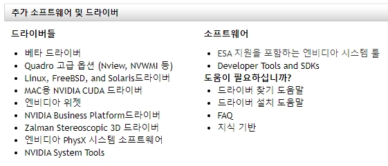 추가 소프트웨어는 ESA 지원을 포함하는 엔비디아 시스템 툴과 Developer Tools and SDKs가 있습니다. 추가 드라이버로는 베타 드라이버, Quadro 고급옵션, 리눅스/FreeBSD/Solaris, MAC용 NVIDIA CUDA 드라이버, 엔비디아 위젯, NVIDIA Business Platform 및 Zalman Stereoscopic 3D 드라이버, 엔비디아 PhysX 시스템 소프트웨어, NVIDIA System Tools가 있어요.