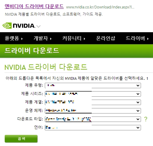 오늘은 엔비디아 드라이버 다운로드 사이트에 접속해보려고 하는데요, 포털 등을 활용하여 검색하시면 바로가기를 통할 수 있습니다. 제품유형, 시리즈, 계열, 운영체제, 다운로드 타입, 언어를 선택하고 [검색] 버튼을 눌러서 원하는 드라이버를 찾을 수 있어요.