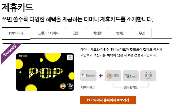 쓰면 쓸수록 다양한 혜택을 제공하는 티머니 제휴카드를 소개하고 있는데요 POP티머니, CU플러스티머니, 금융, 학생증, 멤버십, 무임으로 구분되어 있습니다.