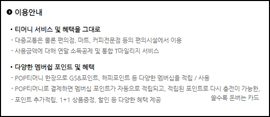 팝티머니의 경우 티머니 카드와 다양한 멤버십카드가 결합되어 결제와 동시에 포인트가 적립되는 혜택이 많은 새로운 선불카드입니다. 티머니 서비스 및 혜택을 그대로 누릴 수 있는데요, 대중교통은 물론이고 편의점이나 마트 및 커피전문점 등의 편의시설에서 이용이 가능합니다.