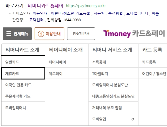 메인화면 상단 좌측에 있는 [전체메뉴] 항목을 선택하여 [티머니카드 소개] 영역에 있는 [제휴카드] 항목을 선택합니다. 이외에도 일반카드, 외국인 전용 카드, 주문제작형 카드, 모바일티머니 항목이 있어요.