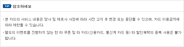 본 카드의 서비스내용은 당사 및 제휴사 사정에 따라서 사전고지 후 변경 또는 중단될 수 있으며, 카드 이용금액에 따라서 제한될 수 있습니다. 별도의 이벤트를 진행하지 않는한 타 쿠폰 및 타 카드의 타 할인혜택 중복사용은 불가합니다.