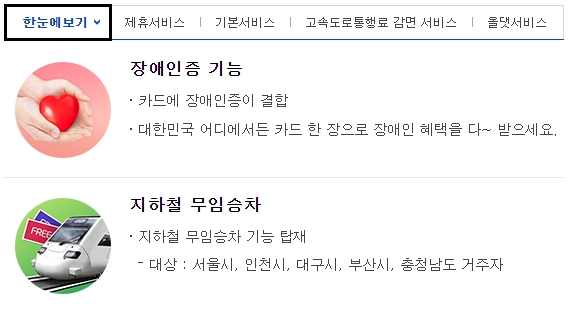 카드에 장애인증이 결합되어 있으며, 대한민국 어디서든 카드 한장으로 장애인 혜택을 모두 받을 수 있습니다. 지하철 무임승차 기능이 탑재되어 있고 대상은 서울시, 인천시, 대구시, 부산시, 충청남도 거주자입니다.