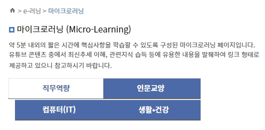 다음은 마이크로러닝을 보겠습니다. 약 5분 내외의 짧은시간에 핵심사항을 학습할 수 있도록 구성된 마이크로러닝 페이지이며, 유튜브 컨텐츠 중에서 최신추세의 이해와 관련지식 습등 등에 유용한 내용을 발췌하여 링크형태로 제공하고 있습니다. 카테고리는 직무역량, 인문교약, 컴퓨터, 생활/건강이 있어요.