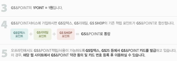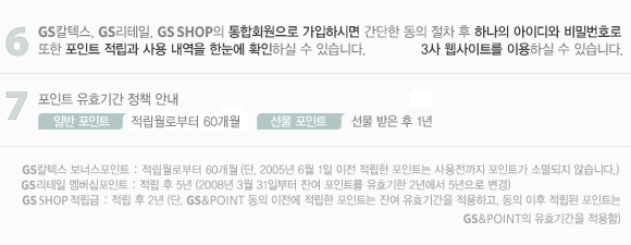 GS칼텍스, GS리테일, GS샵의 통합회원으로 가입하시면 간단한 동의절차 후 하나의 아이디와 비밀번호로 3사 웹사이트를 이용할 수 있으며 포인트 적립과 사용내역을 한눈에 확인할 수 있습니다. 포인트 유효기간 정책은 일반 포인트의 경우 적립월로부터 60개월까지이고, 선물 포인트의 경우 선물받은 후 1년까지입니다.