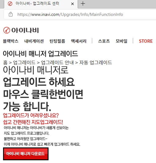 업그레이드 센터 페이지에 접속하시면 아이나비 매니저 다운로드 그리고 설치작업을 진행할 수 있습니다. 아이나비 매니저로 마우스 클릭한번이면 업그레이드가 가능하다고 하는데요, 사이트 주소는 아래 이미지를 참고하시면 됩니다.