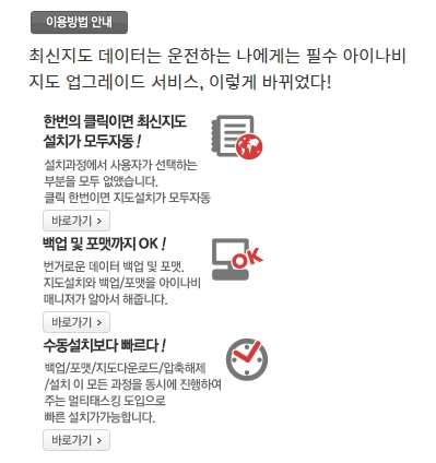 이용방법 안내를 보시면 어떤점들이 바뀌었는지 확인할 수 있습니다. 설치과정에서 사용자가 선택하는 부분을 모두 없앴으며, 클릭 한번이면 지도설치가 모두 자동으로 진행됩니다.
