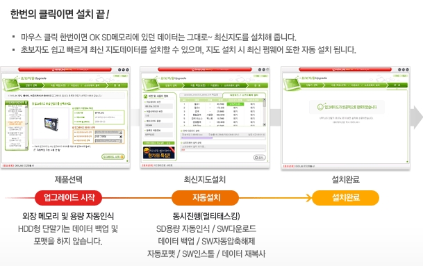 마우스 클릭 한번이면 오케이인데요, DS메모리에 있던 데이터는 그대로 유지하면서 최신지도를 설치해줍니다. 초보자도 쉽고 빠르게 최신 지도데이터를 설치할 수 있으며, 지도설치시 최신 펌웨어 또한 자동으로 설치됩니다. 과정은 제품선택 및 업그레이드 시작, 최신지도 설치 및 자동설치, 설치완료 순입니다.