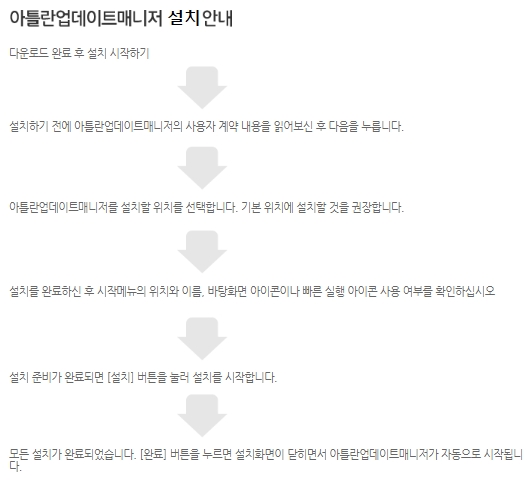 다운을 완료 후 설치를 시작할 수 있으며, 인스톨 하기전에 아틀란 업데이트 매니저의 사용자 계약내용을 읽어보신 후 다음으로 넘어가주세요. 설치할 위치를 선택할 수 있는데요, 기본 위치에 설치할 것을 권장하고 있습니다.