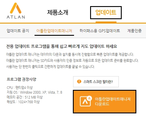아틀란 업데이트 매니저는 데이터의 다운과 설치를 동시에 진행하기에 빠른 업데이트를 제공하며, SD카드와 사용자의 인증정보로 자동으로 모든 업데이트 준비를 완료합니다. 또한 사용자는 단 한번의 클릭으로 간편하게 업데이트를 마칠 수 있습니다. 프로그램 권장사양과 스마트 스크린 필터에 대해서도 체크해보시구요, 주황색 네모의 [다운로드] 버튼을 눌러서 프로그램을 받아주시기 바랍니다.