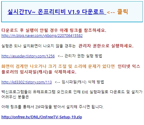 설치파일을 다운받아서 인스톨 후 실행하시면 되는데요, 실행은 되지만 설치화면이 나오지 않을 경우에는 관리자 권한으로 실행해줍니다. 화면이 검게 나오거나 크기조절 및 소리에 문제가 있다면 인터넷 익스플로러의 임시파일 및 캐시를 삭제해주세요. 백신프로그램들의 유해프로그램 오인으로 인하여 exe 실행파일로 다운로드 및 설치가 어려우신 분들은 zip파일을 받아서 설치하시면 됩니다.
