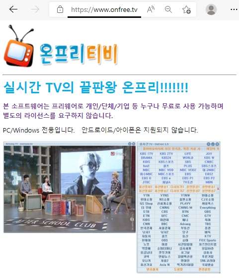 TV채널들을 한곳에 모아서 원하는 채널을 선택하여 시청할 수 있는데요, 오늘은 지상파 방송보기를 위한 온프리티비 다운받는 방법에 대하여 알아보겠습니다. 실시간 TV의 끝판왕이라고 하는데요, 사이트 주소는 아래 그림과 같습니다.
