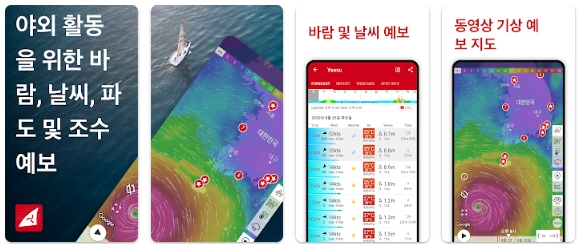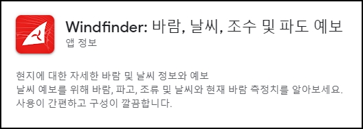 구글 플레이 스토어에 접속하여 위의 그림과 같이 키워드를 입력하고 검색하시면 해당 앱을 찾을 수 있습니다. 바람, 날씨, 조류 등에 대한 예보를 제공하며 가까운 지역을 저장하고 휴가지 날씨를 간단히 확인할 수 있습니다.
