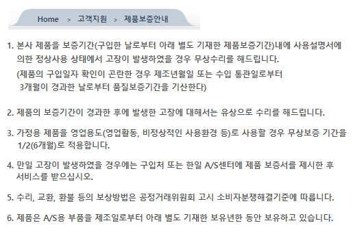 제품보증에 대한 안내도 보겠습니다. 본사 제품을 보증기간 내에 사용설명서에 의한 정상사용 상태에서 고장이 발생하면 무상수리 해드립니다. 고장이 발생한 경우 구입처나 한일 A/S센터에서 제품 보증서를 제시한 후 서비스를 받으세요. 수리와 교환 및 환불 등의 보상방법은 공정거래위원회 고시 소비자분쟁해결기준에 따릅니다.