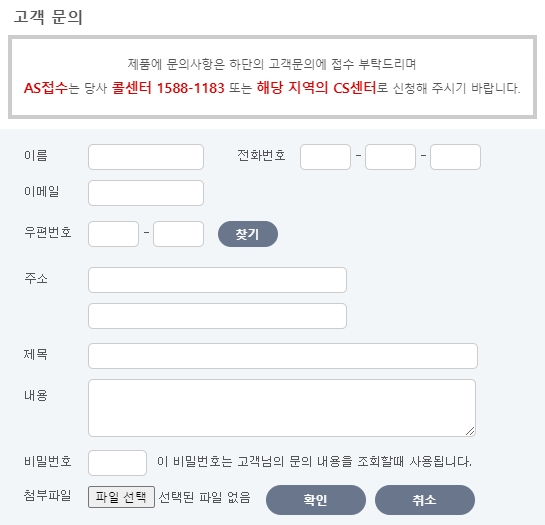 다음은 고객문의 방법을 보겠습니다. [고객지원] 메뉴로 들어가서 [고객문의] 항목을 선택하시면 되는데요, 제품에 대한 문의사항을 접수할 수 있고, AS접수는 당사 콜센터 전화번호인 1588-1183번이나 해당 지역의 CS센터로 신청하시면 되겠습니다.
