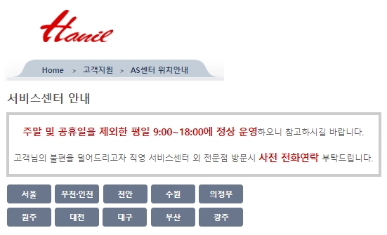 서울, 부천/인천, 천안, 수원, 의정부, 원주, 대전, 대구, 부산, 광주에 위치한 서비스센터를 찾을 수 있습니다. 평일 09시~18시까지 운영하며, 직영 서비스센터 외 전문점 방문시 사전에 전화연락을 하시기 바랍니다.