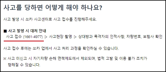 사고발생시 접수번호는 1661-4977번인데요, 쏘카 운행도중 사고가 발생하면 사고센터로 접수를 진행해주시기 바랍니다. 접수가 이루어지면 사고현장을 촬영하고, 상대방과 목격자의 인적사항과 차량번호 및 보험사를 확인합니다.