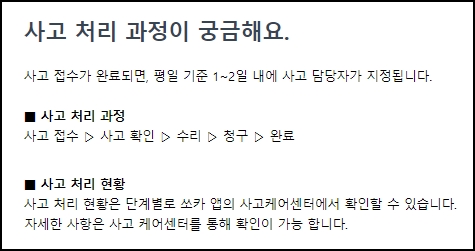 사고접수 완료시, 평일기준으로 1~2일 내에 사고담당자가 지정됩니다. 처리과정은 사고접수 > 사고확인 > 수리 > 청구 > 완료 순입니다. 사고처리 현황은 단계별로 쏘카 앱의 사고케어센터에서 확인할 수 있으며, 자세한 사항은 사고 케어센터를 통하여 확인이 가능합니다.