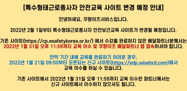 지난 2022년 2월 1일부터 특수형태근로종사자 안전보건교육 사이트가 변경되었는데요, 기존의 사이트에서 수강을 완료하지 않은 배달파트너의 경우 1월 31일까지 교육이수 및 쿠팡이츠 배달파트너 앱에 접속하셔야 하고,
