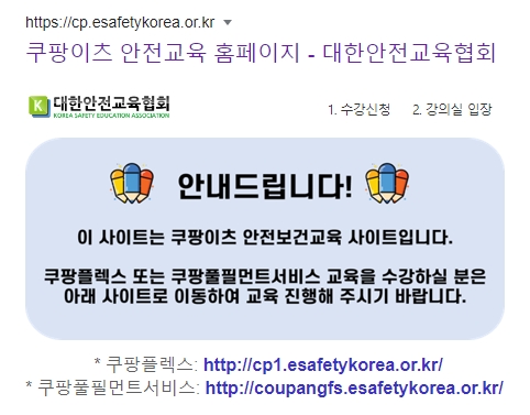 기간내에 교육을 완료하기 어려운 경우에는 신규오픈 사이트(쿠팡 안전보건교육 (wisehrd.com))에서 교육 이수를 하시면 됩니다. 또한 기존 사이트에서 1월 31일까지 교육을 이수한 파트너 분들은 신규 사이트에서 이수하지 않아도 된다고 하네요.