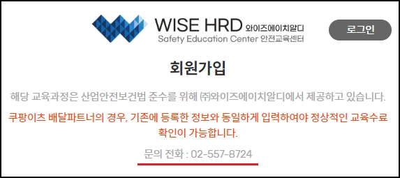 신규사이트에 접속하시면 위의 그림과 같은 화면을 볼 수 있습니다 와이즈에이치알디 안전교육센터인데요, 계정이 있다면 로그인 해주시고 그렇지 않다면 새롭게 회원가입을 합니다. 해당 교육과정은 산업안전보건법 준수를 위하여 WISE HRD에서 제공하고 있으며, 쿠팡이츠 배달파트너는 기존에 등록한 정보와 동일하게 입력해야 정상적인 교육수료 화인이 가능합니다. 문의 전화번호는 02-557-8724번입니다.