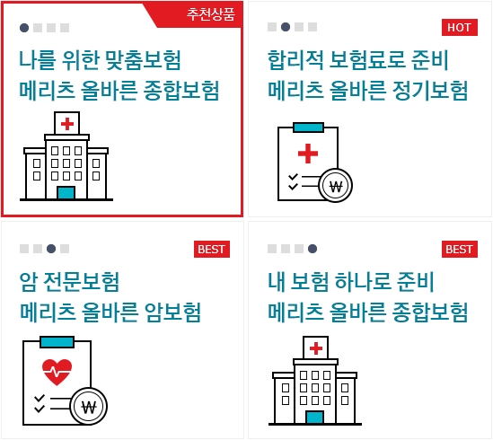 무배당 메리츠 케어프리보험 M-Basket2108 상품에 대하여 알아보도록 하겠습니다. 메리츠화재 홈페이지에 접속해서 [건강/어린이] 카테고리를 선택하고 [통합보험] 영역에 있는 [케어프리보험 M-Bask