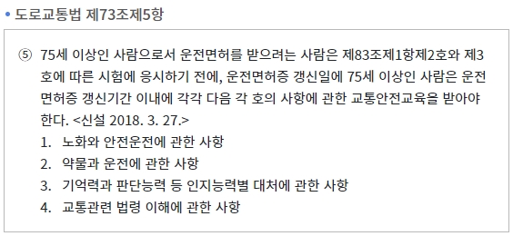 도로교통법 제73조 제 5항에 따라서 75세 이상인 사람이 운전면허를 최초로 취득하거나, 운전면허증을 갱신하기 위해서는 도로교통공단의 고령운전자 교통안전교육을 받아야 합니다.