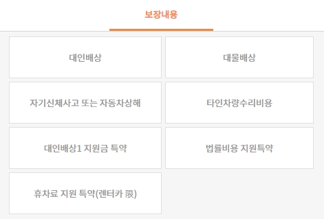 - 휴차료지원특약 - 피보험자가 렌터카를 운전하는 동안 다른 자동차와의 직접적인 충돌 또는 접촉으로 생긴 사고로 타인차량 수리비용에서 보험금이 지급되는 경우 보상
