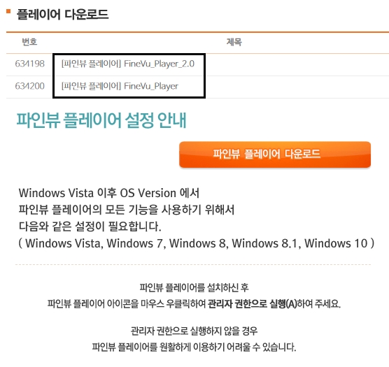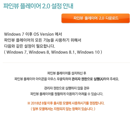 윈도우 비스타 이후의 OS 버전에서 파인뷰 플레이어의 모든 기능을 사용하기 위하여 관리자 권한으로의 실행이 필요합니다. 설치 후 아이콘을 마우스 우클릭하여 관리자 권한으로 실힝해주세요. 그렇지 않을경우 플레이어를 원활하게 이용하기 어려울 수 있습니다. 지원하는 운영체제는 윈도우 비스타, 7, 8, 8.1, 10 버전입니다.