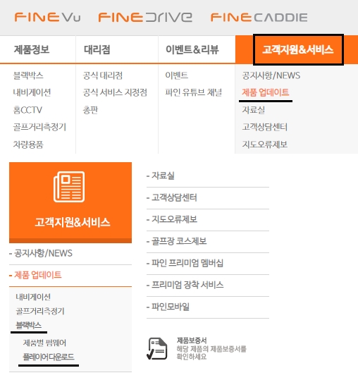이번시간에는 파인뷰 블랙박스 뷰어 또는 플레이어 다운받는 방법을 알아보려고 하는데요, 홈페이지에 접속해서 [고객지원&서비스] 메뉴를 선택하고 [제품 업데이트] 항목을 선택합니다.