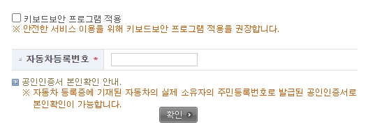 개인명의로 되어있는 자동차의 현재 소유자 또는 공동소유자 중 대표소유자 본인에 한하여 사용자 확인이 가능하고, 주민등록번호로 발급된 공동인증서로 본인인증이 가능합니다. 입력받은 정보는 저장하지 않고 로그아웃시 자동으로 폐기됩니다.