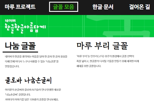 홈페이지에 접속하여 메인화면 상단의 [글꼴모음] 메뉴를 선택하고 [나눔글꼴] 항목을 선택합니다. 네이버가 한글을 생각하는 마음을 담아서 한글자 한글자 정성을 다하여 언제 어디서 누구나 사용할 수 있는 나눔글꼴을 만들었다고 합니다.
