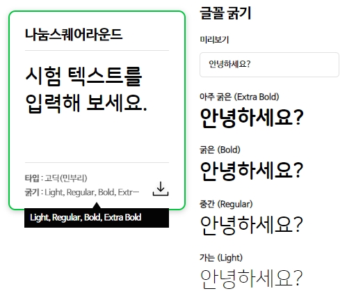 나눔글꼴에는 다양한 폰트들을 포함하고 있으며, 그중에는 나눔스퀘어라운드 글꼴도 있습니다. 타입은 고딕 및 민부리가 있고, 굵기는 라이트부터 엑스트라볼드까지 있어요.