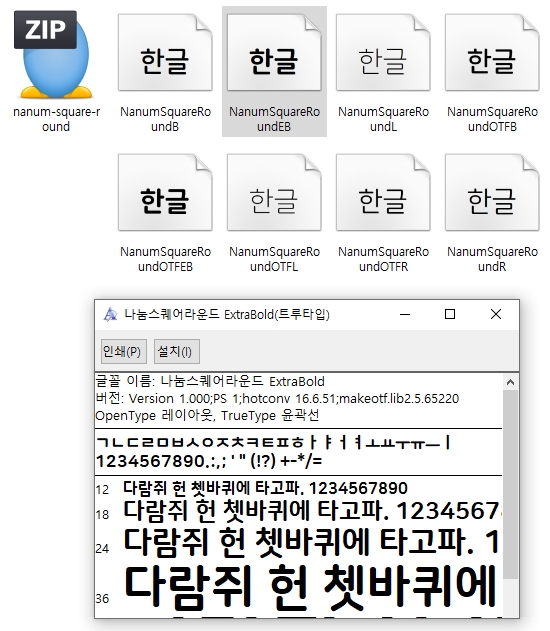 다운로드를 받으면 압축파일을 하나 확인할 수 있고, 압축을 해제하여 폰트들을 확인할 수 있습니다. 원하는 폰트파일을 선택하여 열어주시면 글씨체 이름과 타입정보 등을 확인할 수 있어요. [설치] 버튼을 눌러서 설치 후 이용하시면 되겠습니다. 저작권관 관련하여 정확한 사용조건에 대해서는 네이버 나눔글꼴 라이센스 전문을 참고해주세요.