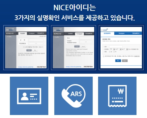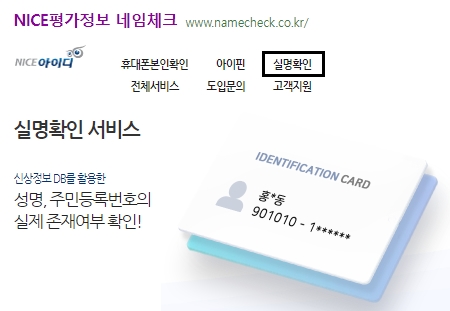 나이스 아이디는 세가지의 실명확인 서비스를 제공하고 있습니다. 첫번째는 주민등록번호 확인입니다. 사용자의 이름과 주민번호에 대한 유효성을 확인합니다. 개명 등으로 인해서 정보 현행화가 안되어 있는경우, NICE아이디 고객센터를 통하여 실명등록할 수 있습니다.