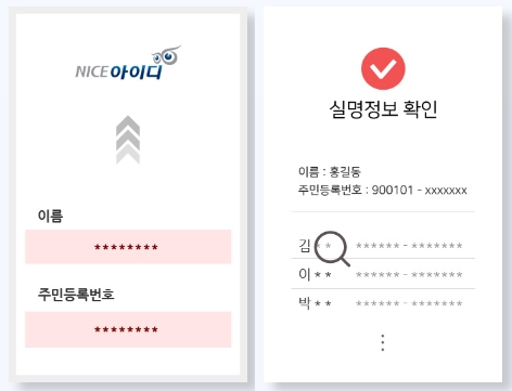 - 실명정보 검증 - NICE평가정보가 보유한 5,700만의 실명정보에 존재하는지 확인