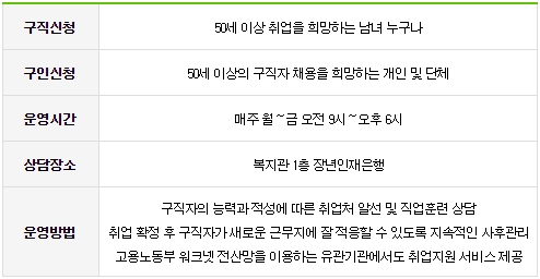 구직신청은 50세 이상 취업을 희망하는 남녀 누구나이고, 구인신청은 50세 이상의 구직자 채용을 희망하는 개인 및 단체입니다. 운영시간은 매주 평일 09시부터 18시까지이고, 상담장소는 복지관 1층 장년인재은행이라고 나와있지만 고령자 인재은행으로 지정된 모든 기관에 대해서는 아래 표를 참고하시면 됩니다.