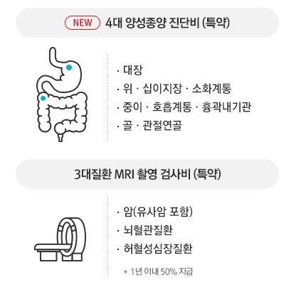 또한 특약가입시, 건강검진을 받을때 발견하기 쉬운 대장 및 위 용종은 수술하지 않더라도 진단을 받으면 보장받을 수 있습니다. 3대질환 진단 및 치료를 위한 필요소견을 받아서 MRI 촬영시 검사비를 지원하는데요, 해당특약은 5년/10년 갱신으로 갱신시 보험료가 인상될 수 있습니다.