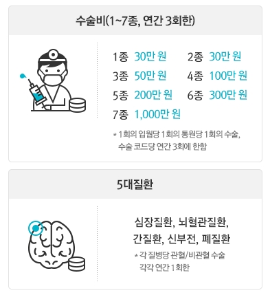 그리고 해당특약 가입시 약관에서 정한 수술종류에 따라 1~7종 수술비를 보장하고, 치료비 걱정되는 심장질환/뇌혈관질환/간질환/신부전/폐질환은 더 든든하게 대비할 수 있습니다.