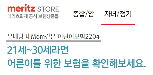 Meritz store 메리츠화재 공식 보험상품몰 홈페이지에 접속해서 [자녀/정기] 카테고리의 [자녀보장보험] 메뉴를 선택하시면 네가지의 상품을 확인할 수 있습니다. 각각은 내Mom같은 베이비보험, 내Mom같은 우리아이보험, 내Mom같은 어린이보험, The좋은 어린이보험입니다. 오늘은 메리츠 내맘같은 어린이보험 상품에 대한 안내를 드리려고 하는데요, 21세~30세라면 어른이를 위한 보험을 확인해보라고 합니다.