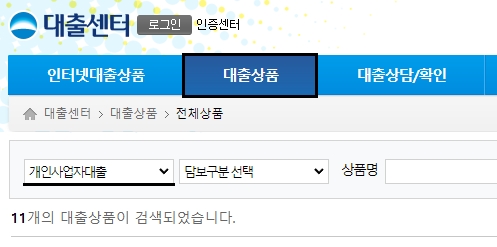 우리은행 대출센터 페이지에 접속하시면 되는데요 [대출상품] 메뉴를 선택하고 [개인사업자대출] 항목을 선택하시면 현재시간 기준으로 총 11개의 상품들을 확인할 수 있습니다.