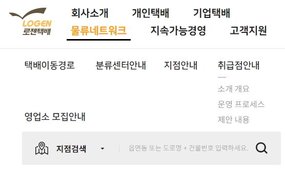 홈페이지에 접속하여 [물류네트워크] 메뉴를 선택하시면 택배이동경로, 분류센터안내, 지점안내, 취급점안내, 영업소 모집안내를 확인할 수 있습니다. 검색은 지점 또는 취급점으로 할 수 있고, 읍면동 또는 도로명+건물번호를 입력하시면 됩니다.